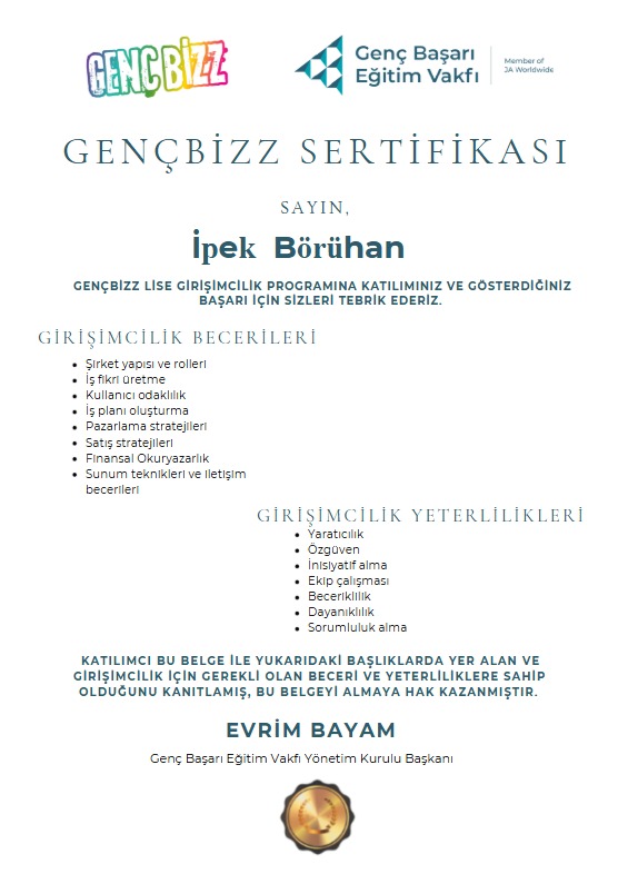 I participated in an entrepreneurship project by forming my own team, establishing a company with them, writing various reports, and preparing our business plan, market research, and much more. Since I managed to carry this project to the semifinals, I became eligible to take the ESP exam. The ESP (Entrepreneurial Skills Pass) Certificate is an international certification that proves students aged 15 to 19 have experienced real entrepreneurship and possess the knowledge, skills, and competencies required to start a business or to be successfully employed. In this exam, the questions we were asked were related to our company-creation experience, the knowledge we gained—including terminology—our behaviors, and how accurately we completed each step of the program. As a result, I was able to prove that I made full use of this initiative by scoring 100 points on my ESP exam.